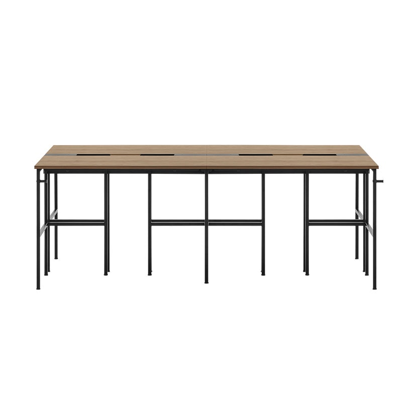 スリムなブラック脚で圧迫感のない印象に。木目調天板には大きめのスチール製配線ボックスを搭載し、ケーブルをすっきり収納。奥行は配線ボックスを除くと600mmあり、ゆったりと作業可能。自由に席を選べるフリーアドレスデスクのみならず、固定席やミーティングテーブルとしても活用可能。