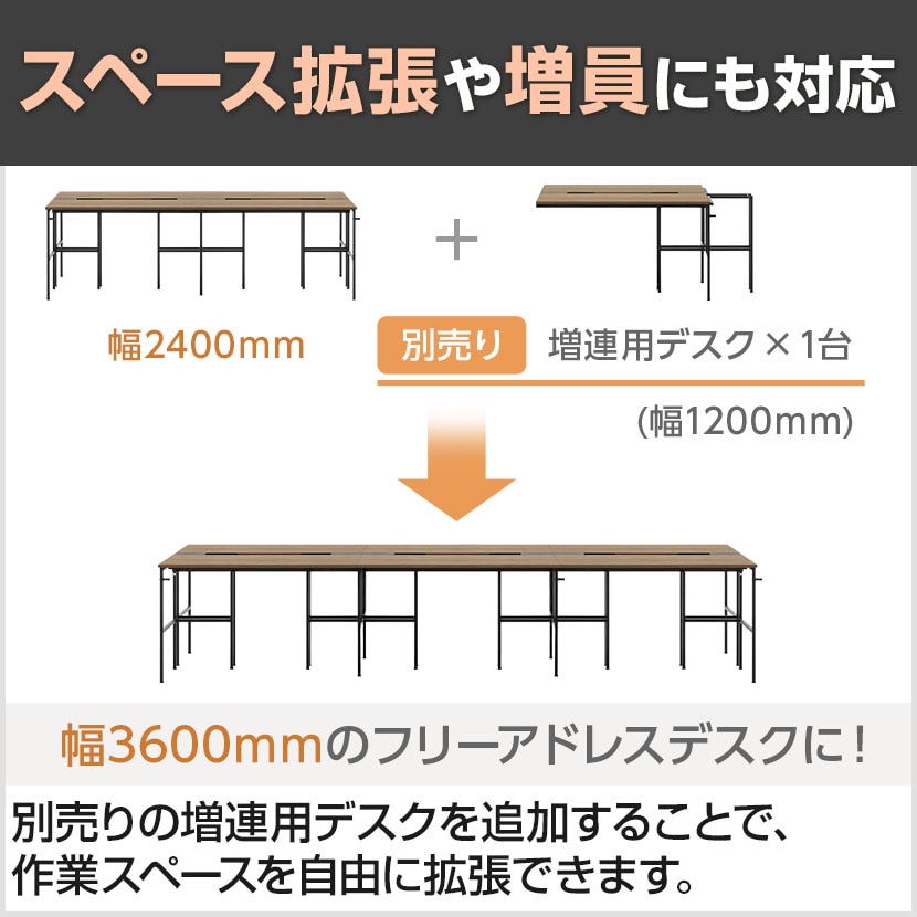 別売りの増連用デスクを追加することで、作業スペースを自由に拡張できます。後からの人員増加にもフレキシブルに対応。