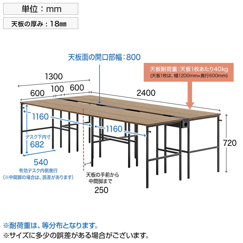 外寸奥行1300mmで向かいの人との距離をしっかり確保。天板の有効奥行は600mmあり、PCや資料を並べても余裕の広さです。