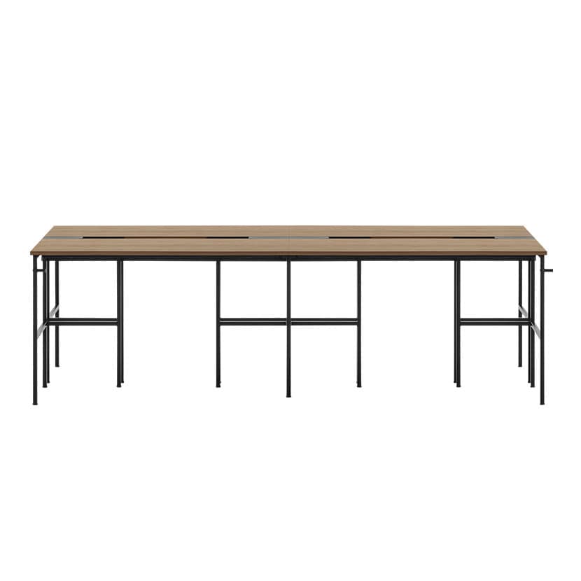 スリムなブラック脚で圧迫感のない印象に。木目調天板には大きめのスチール製配線ボックスを搭載し、ケーブルをすっきり収納。奥行は配線ボックスを除くと600mmあり、ゆったりと作業可能。自由に席を選べるフリーアドレスデスクのみならず、固定席やミーティングテーブルとしても活用可能。