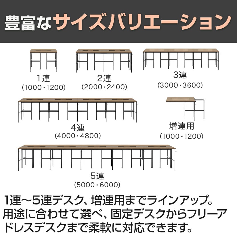 1連~5連デスク、増連用までラインアップ。用途に合わせてサイズや連数を選べ、固定デスクからフリーアドレスデスクまで柔軟に対応できます。