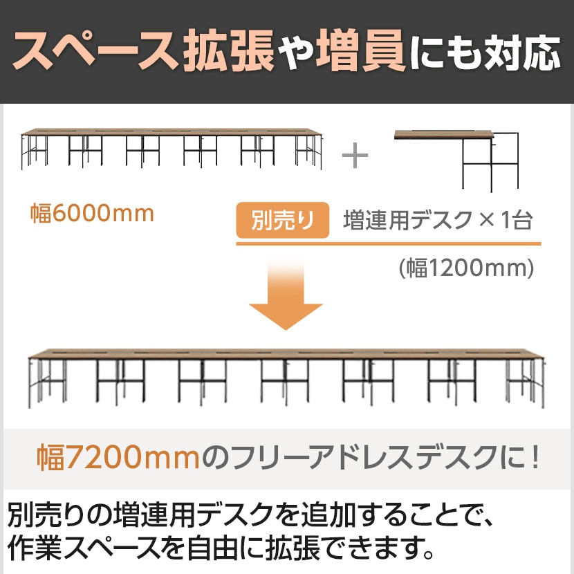 別売りの増連用デスクを追加することで、作業スペースを自由に拡張できます。後からの人員増加にもフレキシブルに対応。