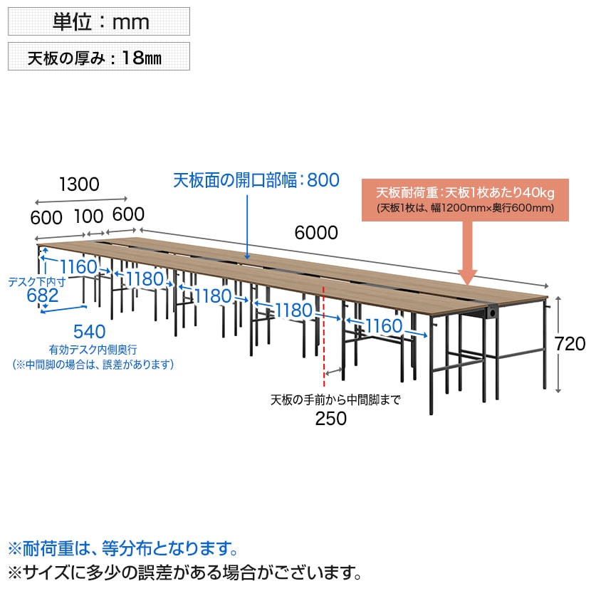外寸奥行1300mmで向かいの人との距離をしっかり確保。天板の有効奥行は600mmあり、PCや資料を並べても余裕の広さです。