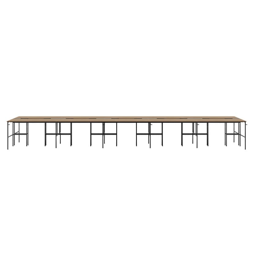 スリムなブラック脚で圧迫感のない印象に。木目調天板には大きめのスチール製配線ボックスを搭載し、ケーブルをすっきり収納。奥行は配線ボックスを除くと600mmあり、ゆったりと作業可能。自由に席を選べるフリーアドレスデスクのみならず、固定席やミーティングテーブルとしても活用可能。