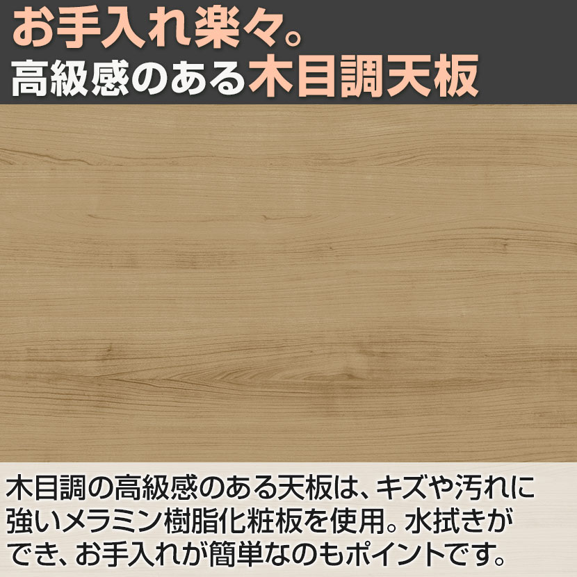 木目調の高級感のある天板は、キズや汚れに強いメラミン樹脂化粧板を使用。水拭きができ、お手入れが簡単なのもポイントです。