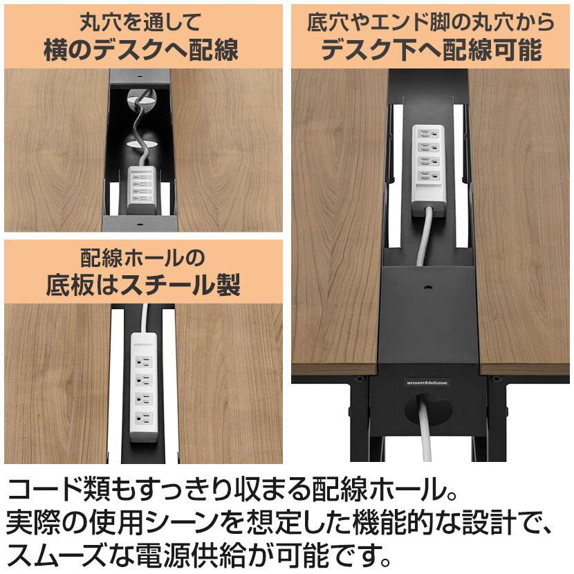 マグネット付き電源タップに対応する収納部をはじめ、実際の使用シーンを想定した機能的な配線ホールも特長です。具体的な配線経路をイメージして、両端のエンド脚や連結部に、すっきりと配線を通すコード穴を装備。スムーズな電源供給を可能にし、働きやすいオフィス環境へ導きます。