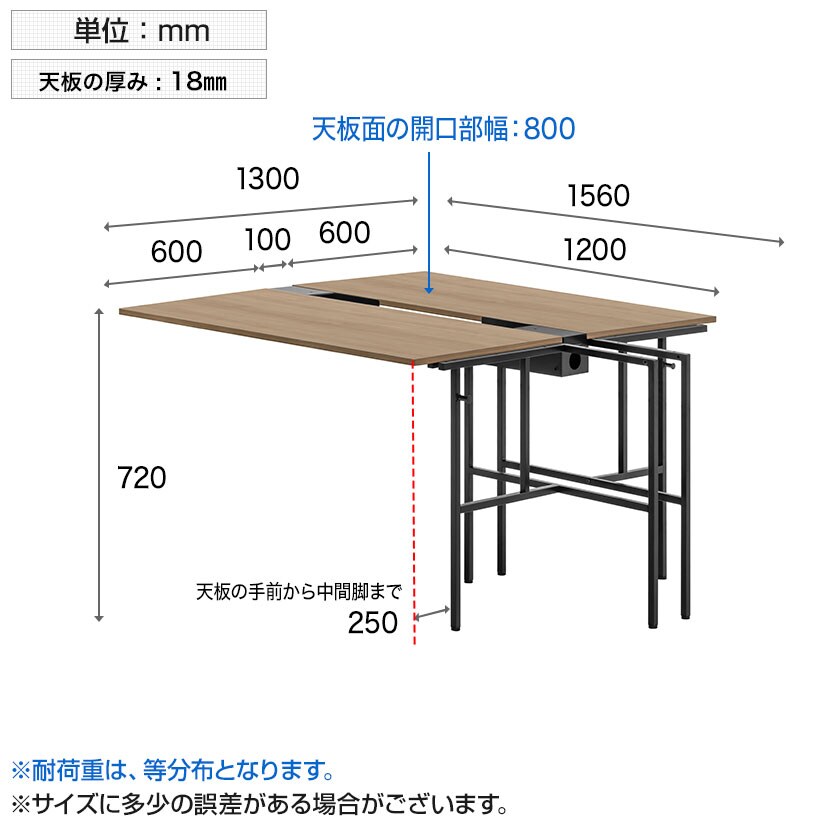 外寸奥行1300mmで向かいの人との距離をしっかり確保。天板の有効奥行は600mmあり、PCや資料を並べても余裕の広さです。