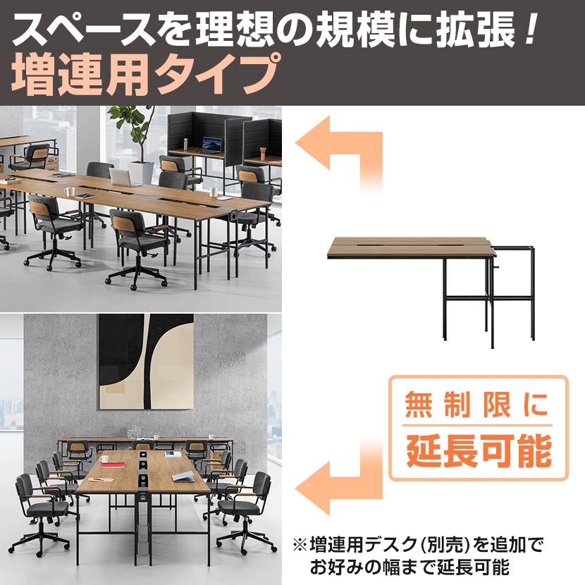 用途や人数に合わせて追加の連結が可能。必要台数を追加することで、従業員の増員に対応。また連結を外して台数を調節することにより、テレワークの導入で出社率に増減がある場合など、新しい働き方にも柔軟に対応できます。フリーアドレス以外に、ミーティングやコワーキングスペースでの使用など、オフィスに幅広く活用できるデスクです。