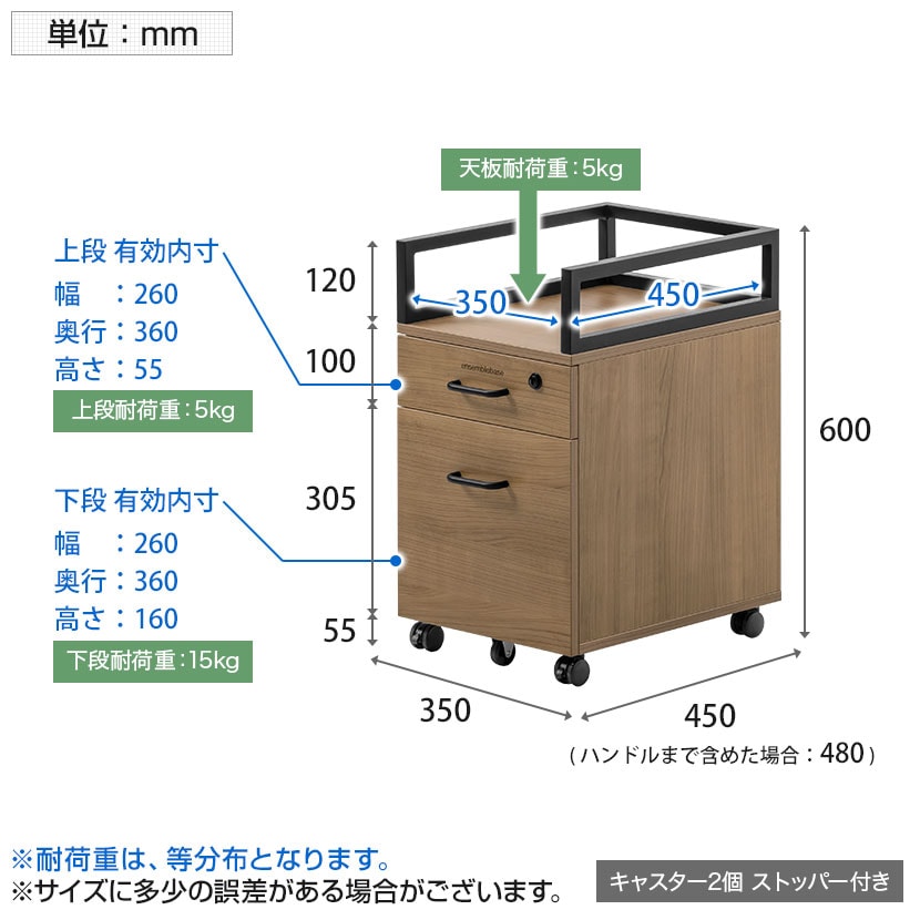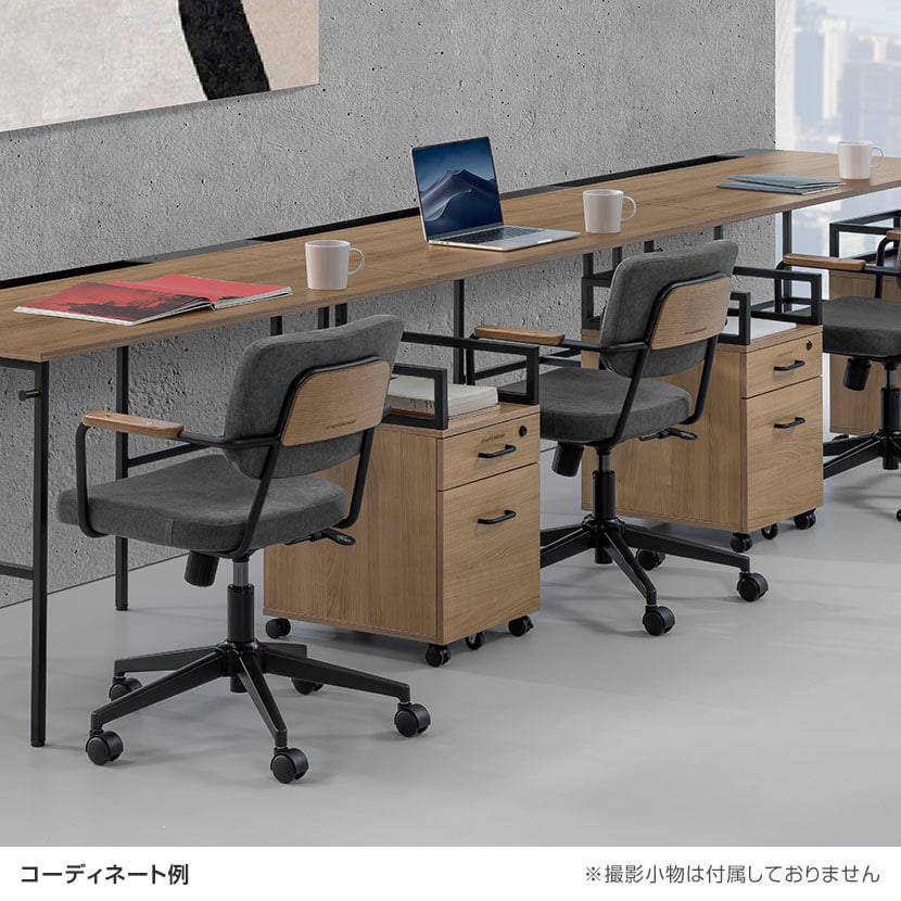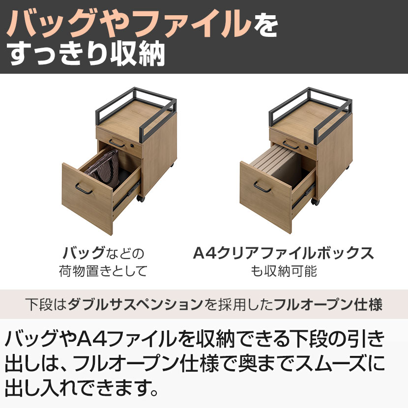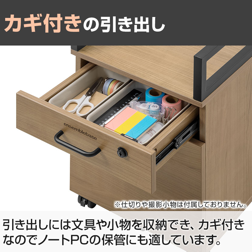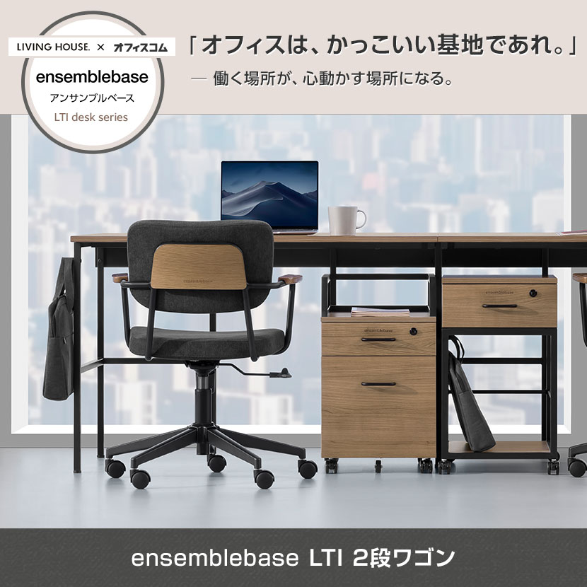 「ensemblebase LTI デスクシリーズ」の二段ワゴン。デスク本体と調和するデザインで統一感を高めます。高さ600mmのコンパクトサイズでデスク下にすっきり収まり、上部のオープンスペースには書類や小物を置くことが可能。1段目はカギ付き、2段目にはA4ファイルを収められる実用的なデスク下ワゴンです。