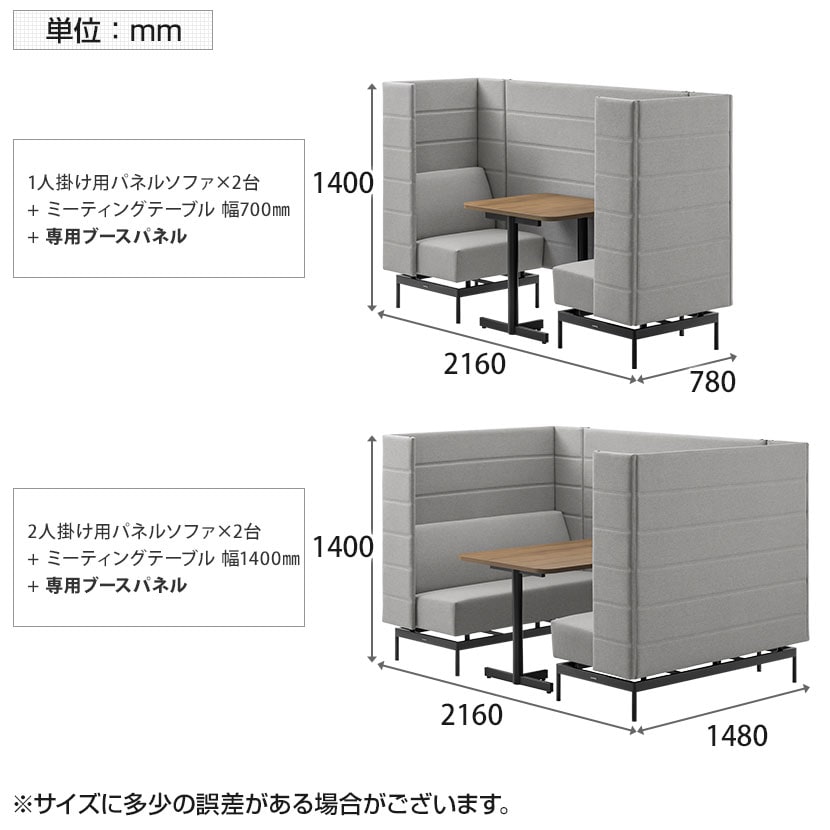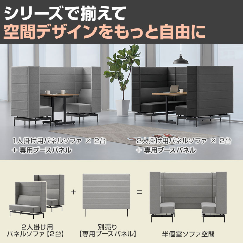 別売りの「一人掛けパネルソファ」、「二人掛けパネルソファ」と組み合わせて設置することで、ブースパネルは半個室のプライベート空間を生み出します。集中作業や商談、休憩など、周囲の視線を気にせず快適に過ごせる環境を手軽に演出できます。