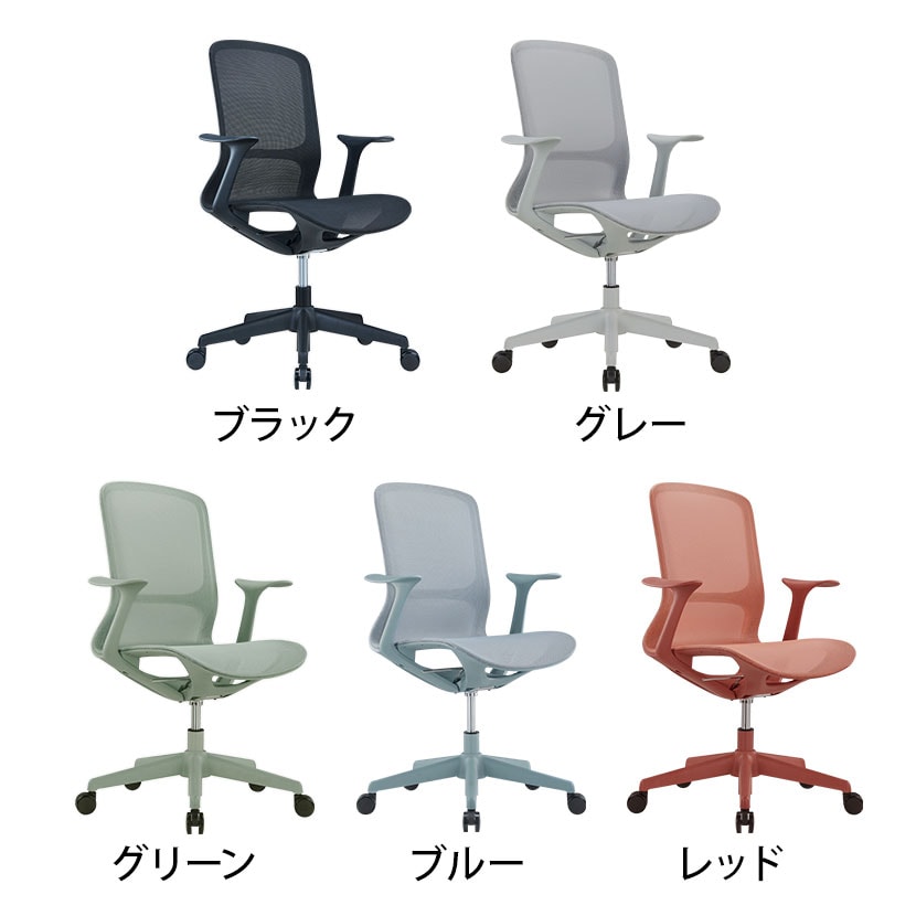 背面と座面に軽やかなメッシュを採用し、フレームから脚部までカラーを統一したモダンなデザインの『レインボーメッシュチェア』。ブラック、ブルー、グリーン、グレー、レッドの5色展開で、オフィスやワークスペースを彩ります。ロッキング機能や座面の上下昇降、スムーズに動けるキャスター付きで、デザイン性と実用性を兼ね備えたチェアです。