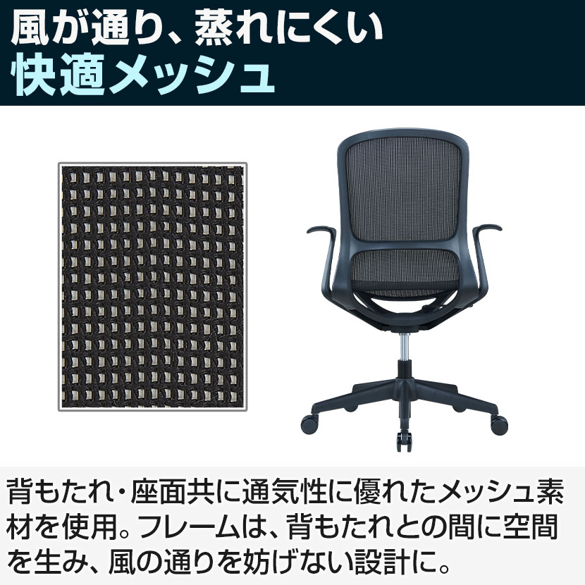 背もたれ・座面共に通気性に優れたメッシュ素材を使用。フレームは、背もたれとの間に空間を生み、風の通りを妨げない設計に。