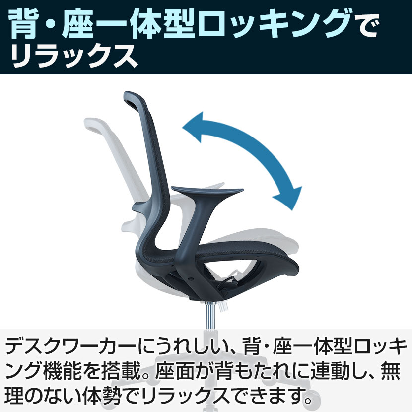 長時間座るデスクワーカーにうれしい、背・座一体型ロッキング機能を搭載。座面が背もたれに連動し、無理のない体勢でリラックスできます。