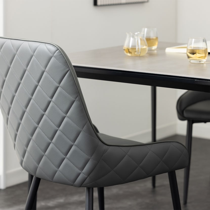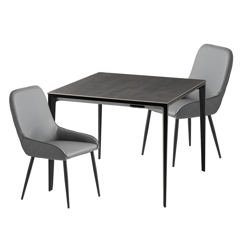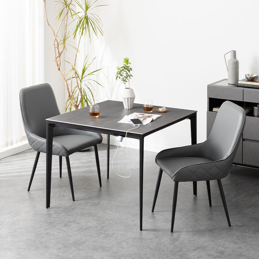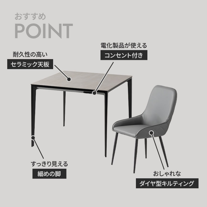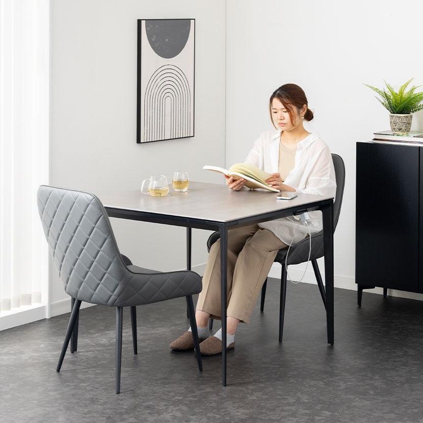 モダンで高級感あふれるセラミック天板と、機能性を高めるコンセントを備えたダイニングセット。熱や傷に強く、お手入れも簡単なテーブルは、日々の食事からワークスペースまで幅広いシーンで活躍します。