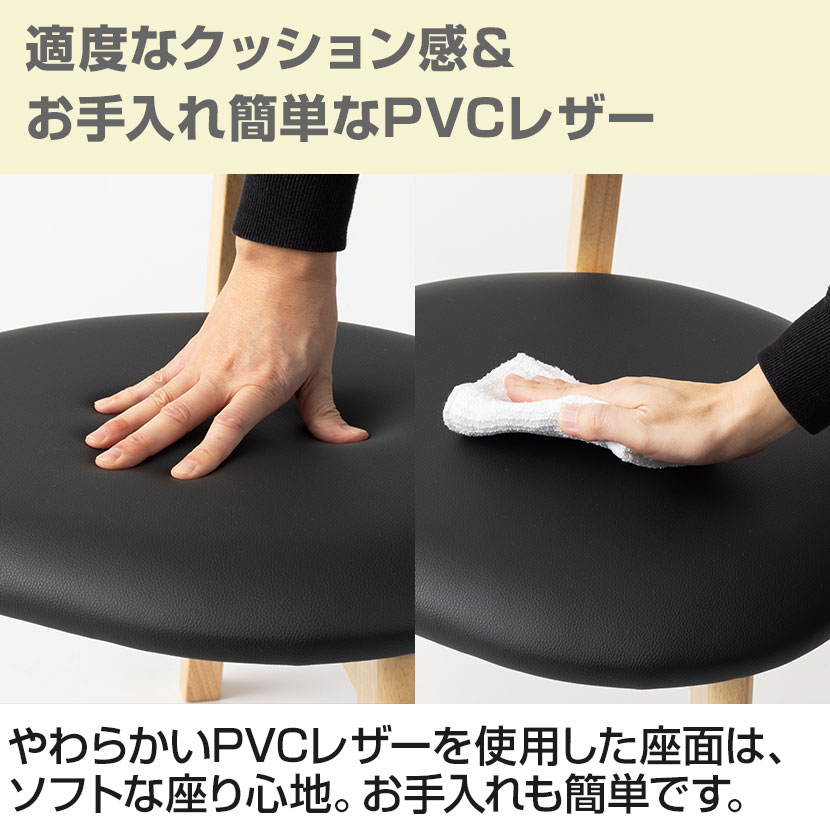 やわらかいPVCレザーを使用した座面は、ソフトな座り心地を実現。水をはじく素材なので、お手入れも簡単です。