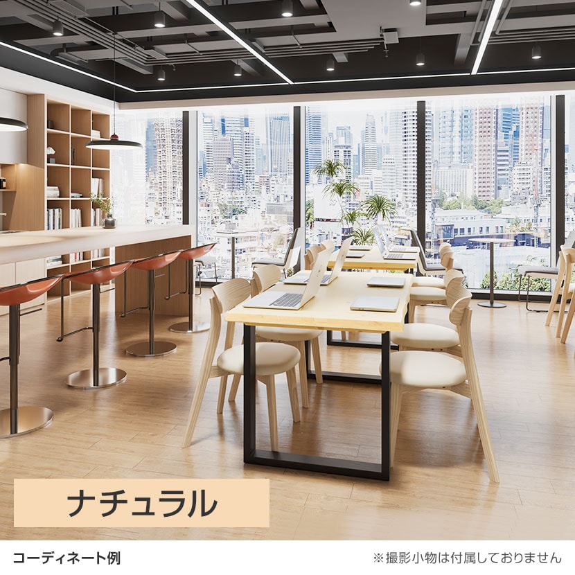 天然木の無垢材天板にラバーウッドの脚を組み合わせた多目的ダイニングテーブル。天板は波のような凹凸のナグリ加工で、触れるたび木の自然な表情を感じられます。脚は淡い色合いで落ち着いたラバーウッドを使用。オフィスにナチュラルな温かみを添え、居心地の良いミーティング空間を演出します