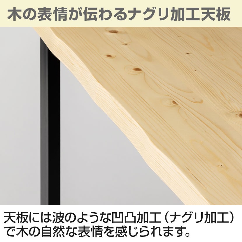 天板には波のような凹凸加工(ナグリ加工)が施されており、触れるたびに木の自然な表情を感じられます。本物の木だからこそ出せる、やさしい風合いです。