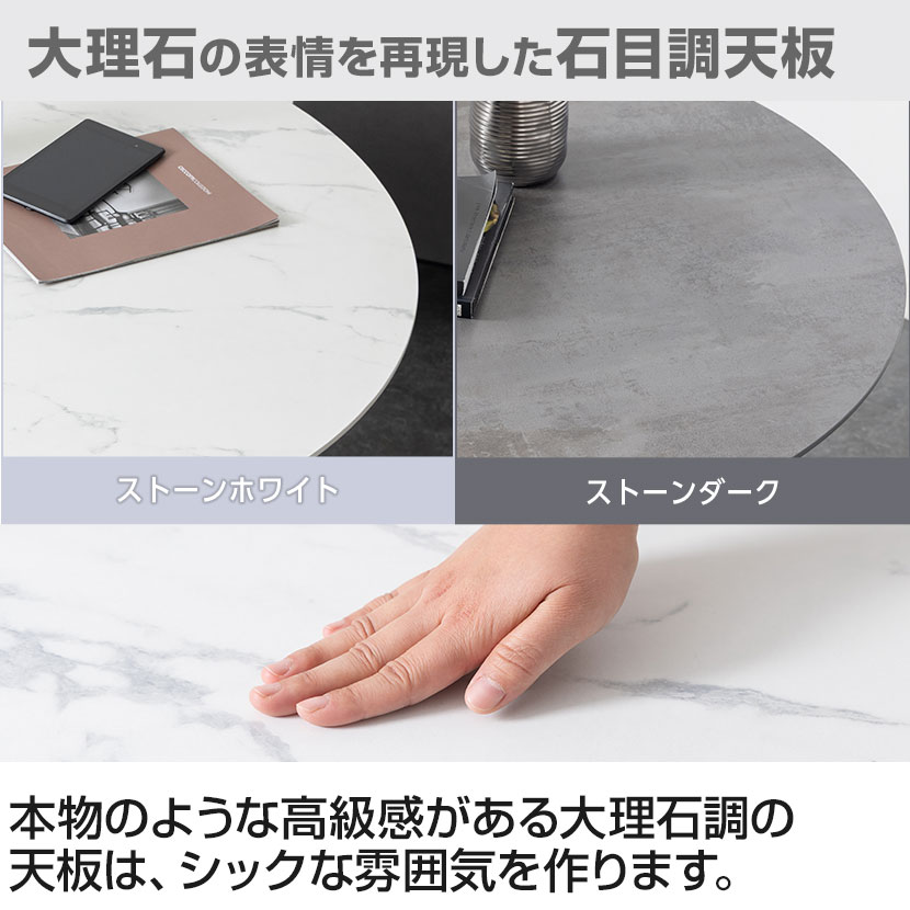 大理石のような模様を再現した石目調の天板は、空間に上品な印象を与えます。ストーンホワイトは明るく洗練された雰囲気を、ストーンダークは落ち着きと重厚感を演出。メラミン樹脂製で柔らかい布などで水拭きして簡単にお手入れできます。滑らかな手触りと硬質な質感で、見た目だけでなく使い心地にもこだわった仕上がりです。