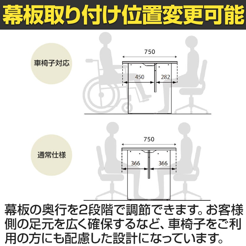 ・幕板の奥行を2段階で調節できお客様側の足元を広く確保するなど、車椅子をご利用の方にも配慮した設計になっています。