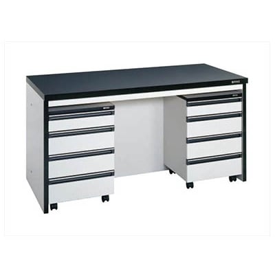薬品に強いトレスパ天板を採用した木製作業台引出しやキャビネットワゴン・架台を用途によって追加することができます