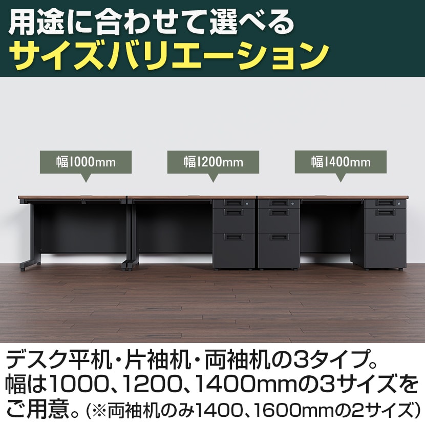 デスクは平机・片袖机・両袖机の3タイプ。幅は1000、1200、1400mmの3サイズをご用意。(※両袖机のみ1400、1600mmの2サイズ)用途に合わせてお選びください。