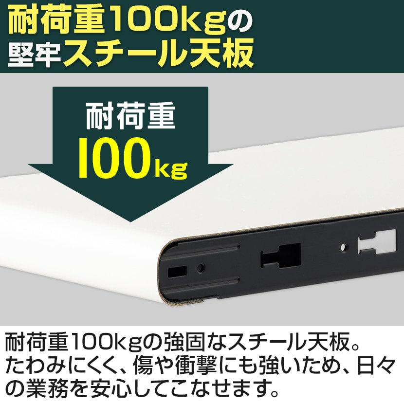 複数のモニターや重たいオフィス機器を置いてもしっかり支える、耐荷重100kgの強固なスチール天板。たわみにくく、傷や衝撃にも強いため、日々の業務を安心してこなせます。