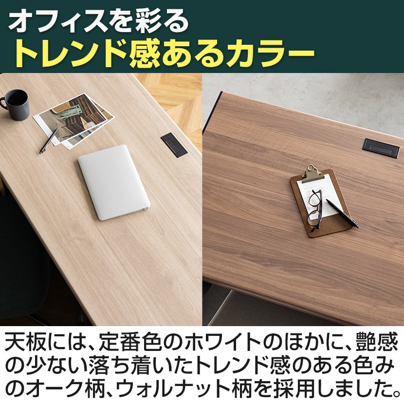 天板には、定番色のホワイトのほかに、艶感の少ない落ち着いたトレンド感のある色みのオーク柄、ウォルナット柄を採用しました。