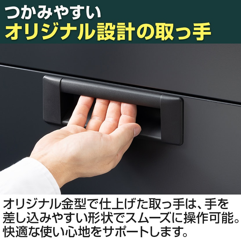 オリジナル金型で仕上げた取っ手は、手を差し込みやすい形状でスムーズに操作可能。 快適な使い心地をサポートします。