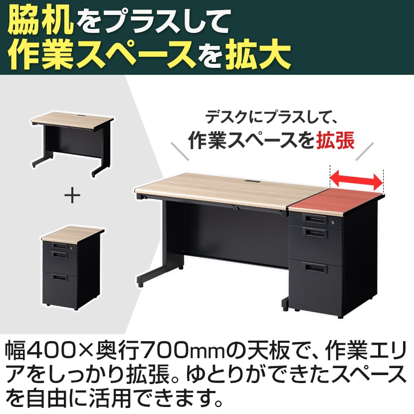 机の横にぴったりと並べて使用できます。幅400×奥行700mmで机上スペースをぐっと拡大。資料を横に置いたり、PCモニターを設置したり、ゆとりができたスペースを自由に活用できます。