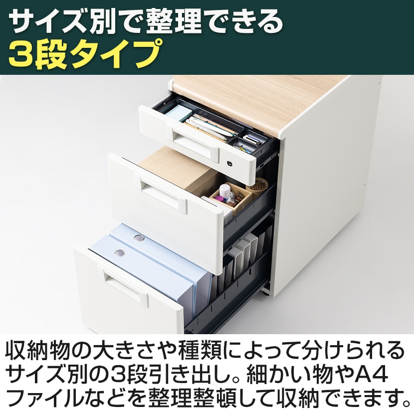 収納物の大きさや種類によって分けられるサイズ別の3段。細かい物やA4ファイルなどを整理整頓して収納できます。