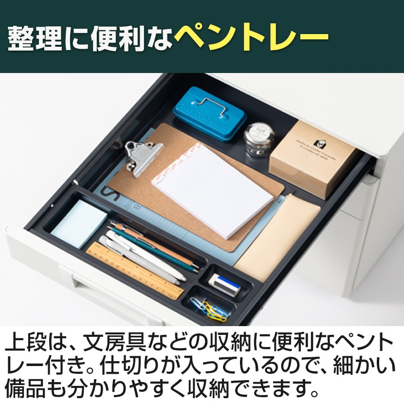 上段は、文房具などの収納に便利なペントレー付き。仕切りが入っているので、細かい備品も分かりやすく収納できます。