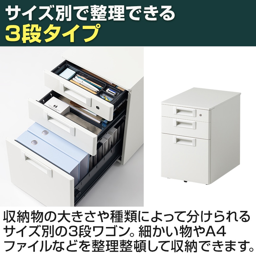 収納物の大きさや種類によって分けられるサイズ別の3段。細かい物やA4ファイルなどを整理整頓して収納できます。