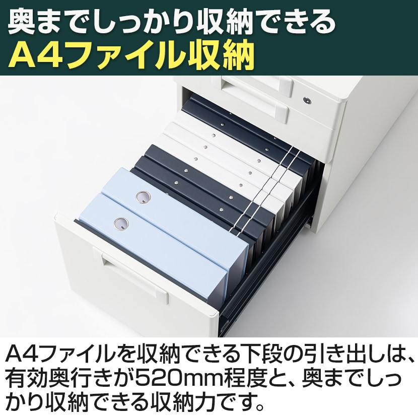 A4ファイルを収納できる下段の引き出しは、有効奥行きが520mm程度と、奥までしっかり収納できる収納力です。
