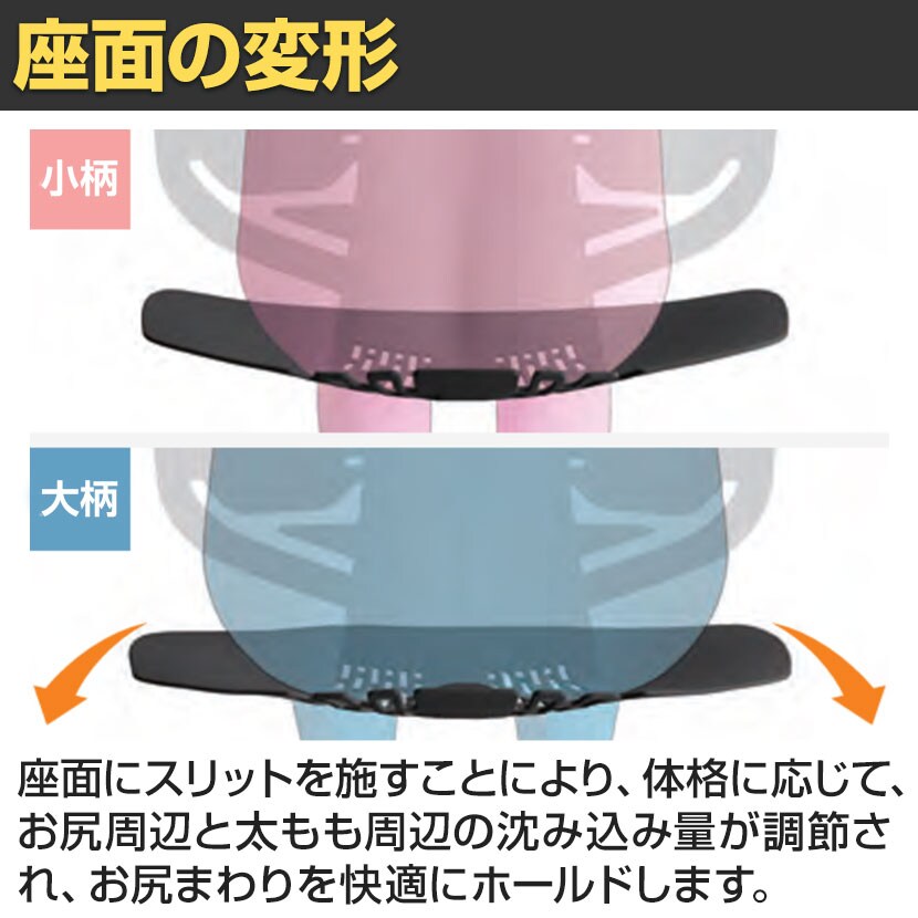 座面前方は太ももを圧迫しないように柔らかく、後方はお尻をしっかりサポートする硬めのクッションを採用。