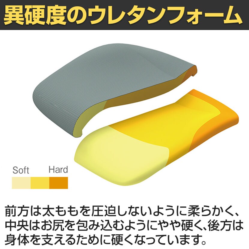 座面前方は太ももを圧迫しないように柔らかく、後方はお尻をしっかりサポートする硬めのクッションを採用。