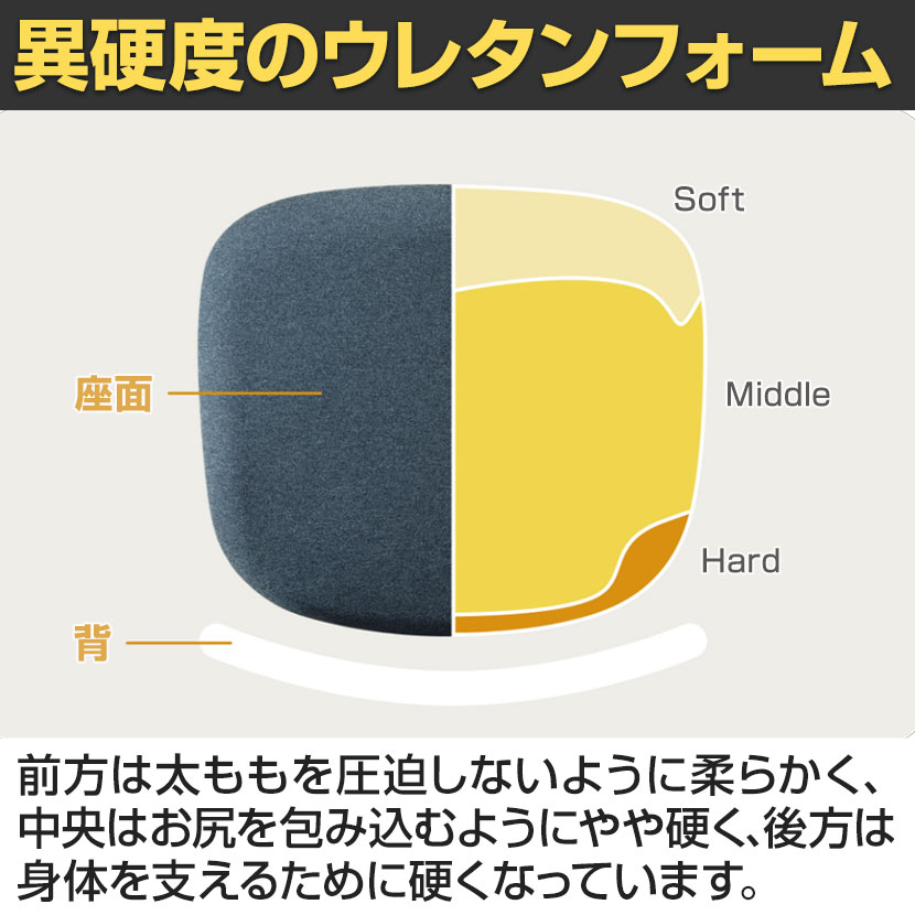 座面前方は太ももを圧迫しないように柔らかく、後方はお尻をしっかりサポートする硬めのクッションを採用。