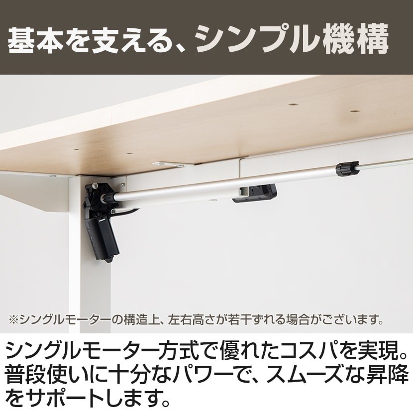 シングルモーター方式で優れたコスパを実現した電動昇降デスク。普段使いに十分なパワーで、スムーズな昇降をサポートします。※シングルモーターの構造上、左右の高さが微少に差異がある場合がございます。