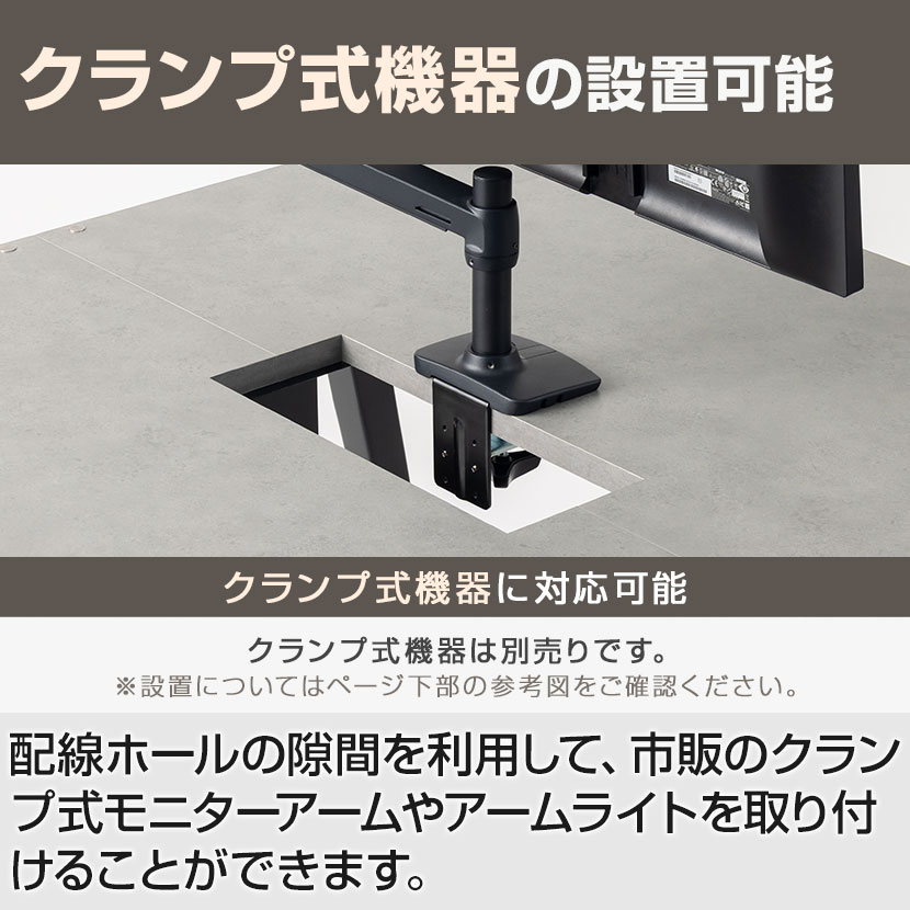 配線ホールの隙間を利用して、市販のクランプ式モニターアームやアームライトを取り付けることができます。