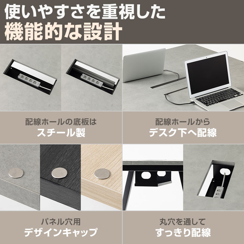 配線ダクトには、マグネット付き電源タップを固定できるほか、配線ダクトの両端にはケーブルを通せるコード穴を装備。スムーズな電源供給を可能にし、働きやすいオフィス環境へ導きます。