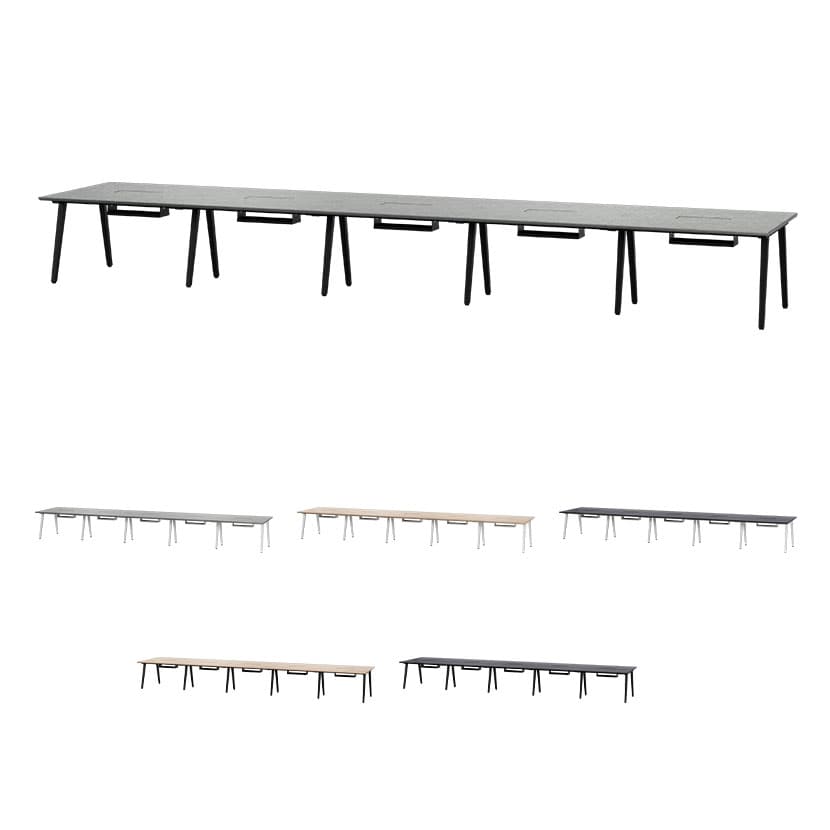 フリーアドレスデスクとミーティングテーブルをシリーズでラインアップ。フリーアドレスデスクは、幅1000mmと幅1200mmの2サイズ展開。共通設計の脚部により、それぞれを自由に増連できるため、「基本は幅1200mmで構成し、一部セクションのみ幅1000mmを連結する」といった変則的なレイアウトにも柔軟に対応します。天板中央には特許取得の「3WAY配線ホール」を搭載。機能性とデザイン性を両立し、快適なオフィス環境を実現します。