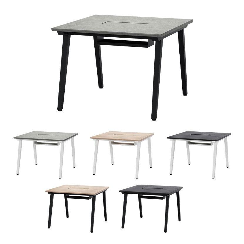 フリーアドレスデスクとミーティングテーブルを、統一感のあるデザインでラインアップ。ミーティングテーブルは、奥行1000mmのコンパクト設計に加え、幅は部屋の広さに応じて1000mm単位で選択可能で、限られたスペースを最大限に有効活用できます。足元には出入りがスムーズなスラント脚を、天板中央には特許取得の「3WAY配線ホール」を搭載。機能性とデザイン性を両立し、快適なオフィス環境を実現します。