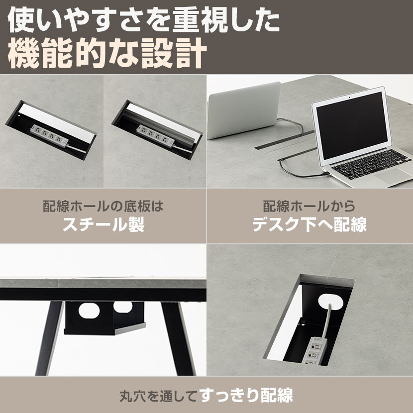 配線ダクトには、マグネット付き電源タップを固定できるほか、配線ダクトの両端にはケーブルを通せるコード穴を装備。スムーズな電源供給を可能にし、働きやすいオフィス環境へ導きます。