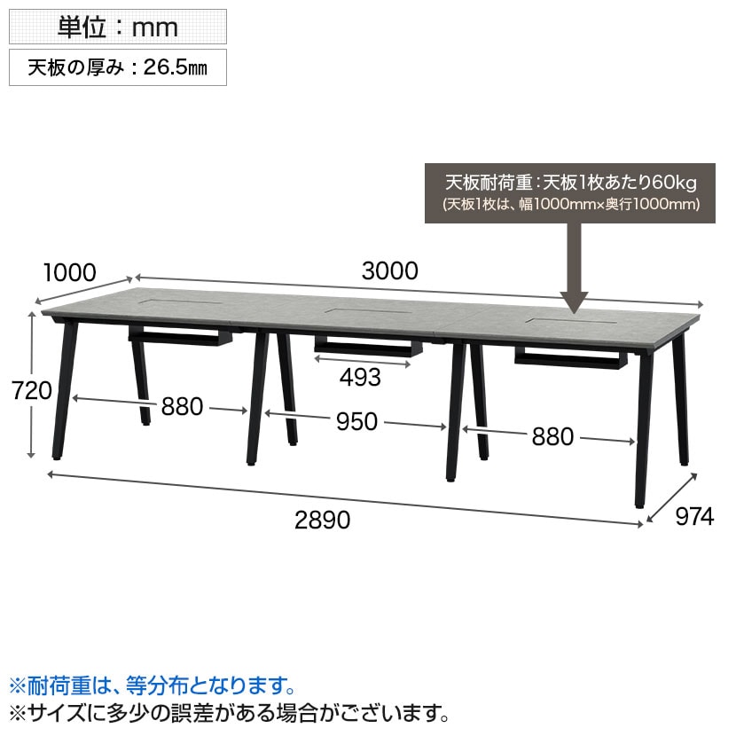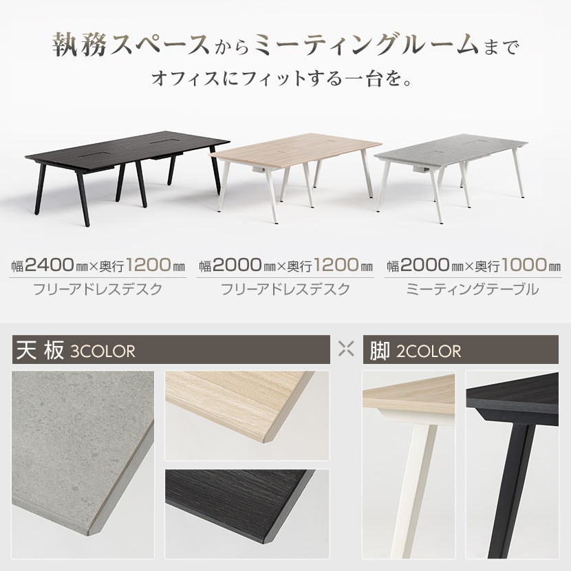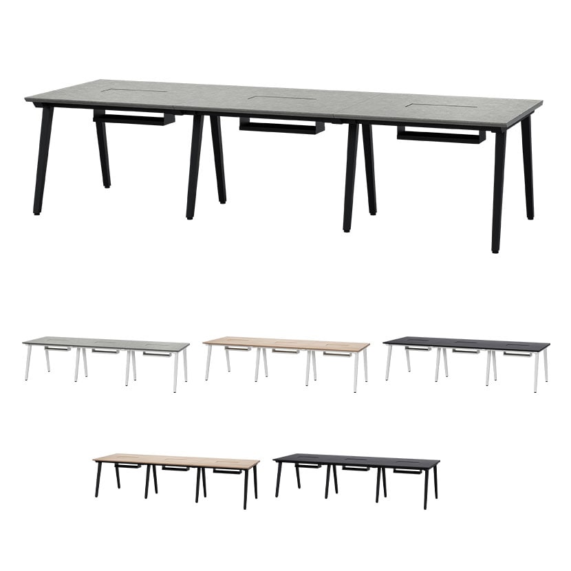 フリーアドレスデスクとミーティングテーブルを、統一感のあるデザインでラインアップ。ミーティングテーブルは、奥行1000mmのコンパクト設計に加え、幅は部屋の広さに応じて1000mm単位で選択可能で、限られたスペースを最大限に有効活用できます。足元には出入りがスムーズなスラント脚を、天板中央には特許取得の「3WAY配線ホール」を搭載。機能性とデザイン性を両立し、快適なオフィス環境を実現します。