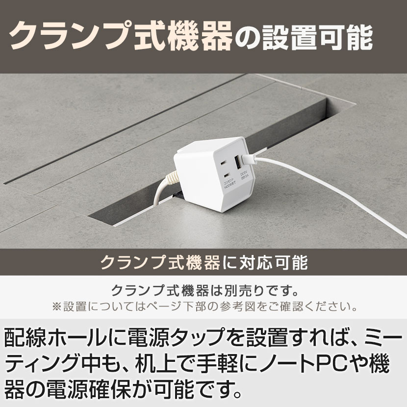 配線ホールにクランプ式機器を取り付け可能。電源タップを設置すれば、ミーティング中も、机上で手軽にノートPCや機器の電源確保が可能です。