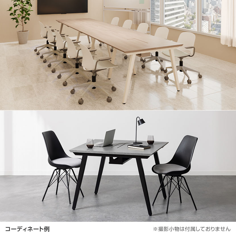 フリーアドレスデスクとミーティングテーブルを、統一感のあるデザインでラインアップ。ミーティングテーブルは、奥行1000mmのコンパクト設計に加え、幅は部屋の広さに応じて1000mm単位で選択可能で、限られたスペースを最大限に有効活用できます。足元には出入りがスムーズなスラント脚を、天板中央には特許取得の「3WAY配線ホール」を搭載。機能性とデザイン性を両立し、快適なオフィス環境を実現します。