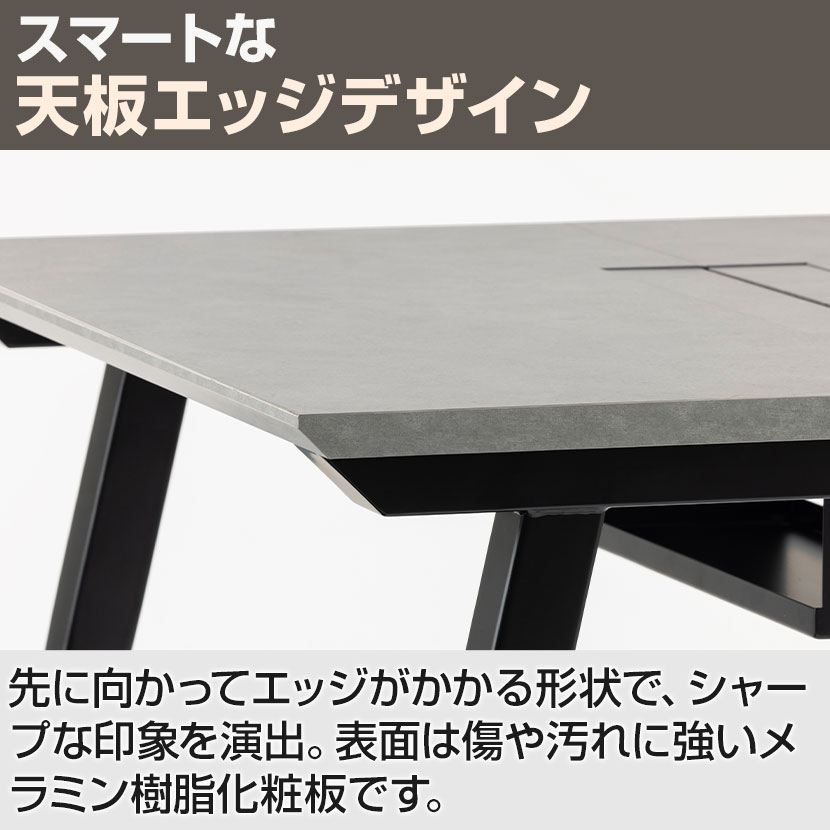 先に向かってエッジがかかる形状で、シャープな印象を演出。表面は傷や汚れに強いメラミン樹脂化粧板です。