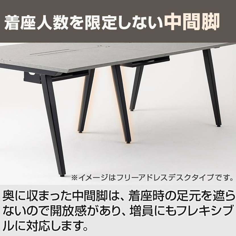 奥に収まった中間脚は、着座時の足元を遮らないので開放感があり、増員にもフレキシブルに対応します。