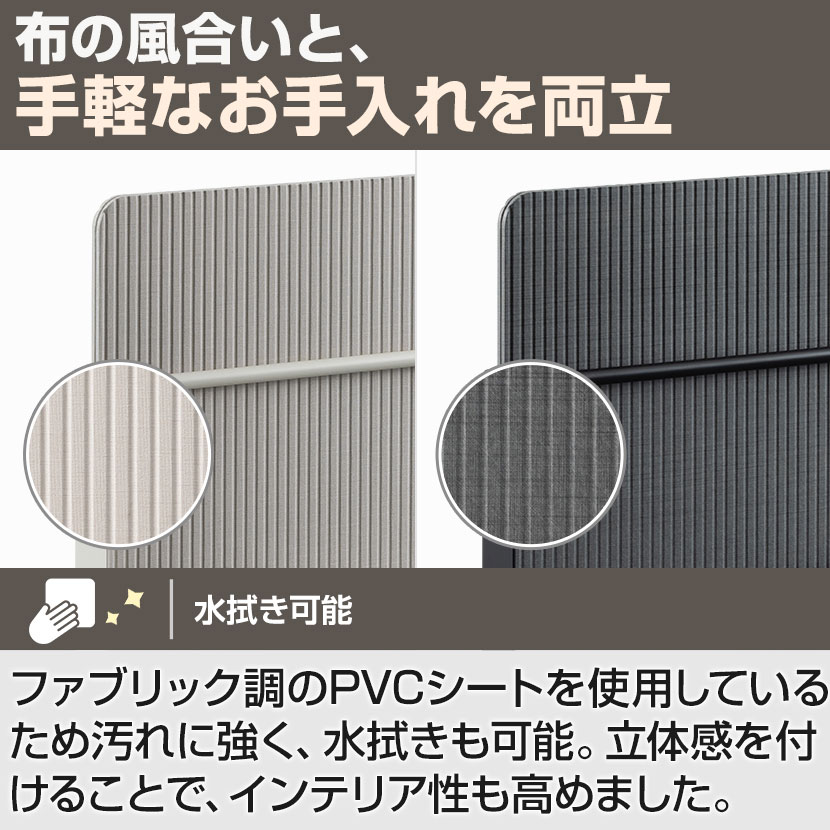 ファブリック調のPVCシートを使用しているため汚れに強く、水拭きも可能。ルーバー加工の立体感を付けることで、インテリア性も高めました。