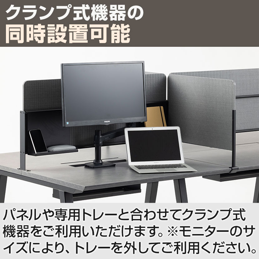 クランプ式機器の取り付け時も、パネルや専用トレーと合わせてご利用いただけます。 ※モニターのサイズにより、トレーを外してご利用ください。