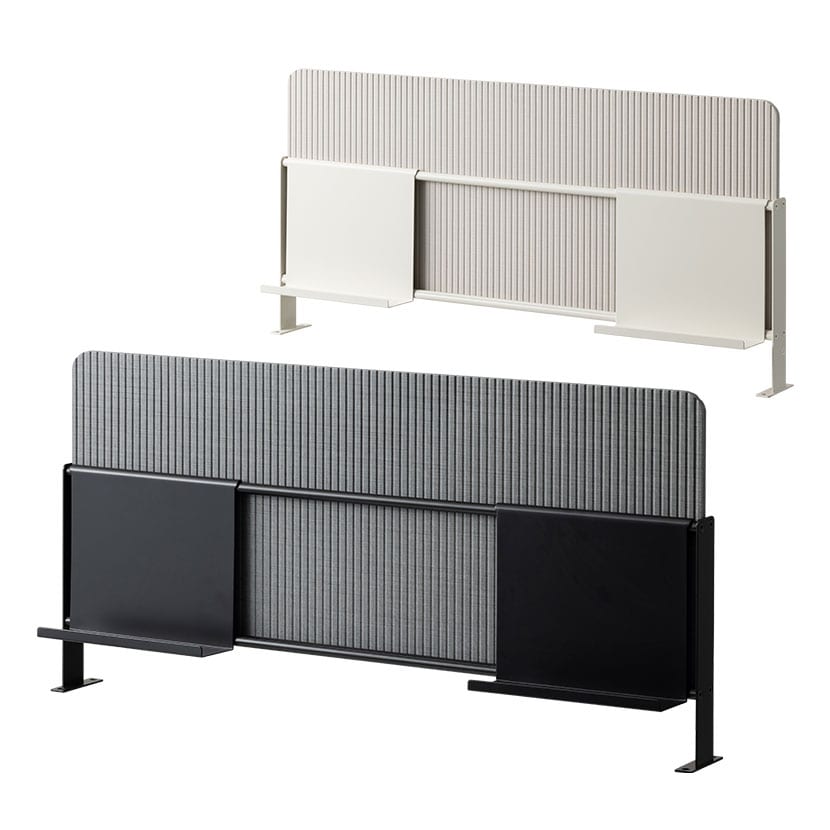 モダンなデザインと機能性を兼ね備えた「EXELEGAフリーアドレスデスク」専用のデスクトップパネルです。カラーはライトグレーxオフホワイト、ダークグレーxブラックの2色をご用意。対向席からの視線を遮って適度なプライバシーを確保し、集中しやすい環境をつくります。付属のマルチトレーにはタブレットや小物を置けるため、天板を広く使えて作業効率もアップします。